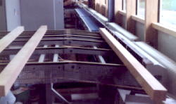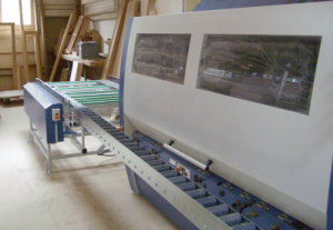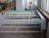 Rückfördern hinter der Bearbeitungsmaschine mit Querpuffer beim Bediener vor der maschine: